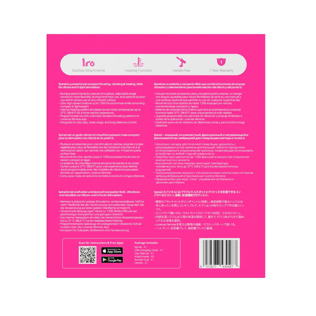 Spinel es un dispositivo de estimulación avanzada que combina empuje, vibración y calor para ofrecer una experiencia totalmente personalizable. Su diseño modular, sus modos de alta potencia y su compatibilidad con la app Lovense Remote lo convierten en una herramienta versátil tanto para uso personal como para demostraciones profesionales.